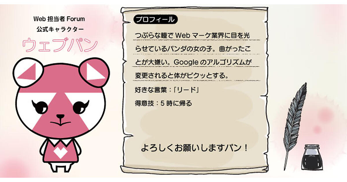 検索アルゴリズムの変更を察知!? 変な特技のパンダ登場! 「ウェブパン」紹介ページ公開Web担Forum公式キャラクター「ウェブパン」の紹介ページです。2018年12月19日 14:16シェア70ポストはてブBluesky2018年10月にWeb担当者Forumに仲間入りした「ウェブパン」のプロフィールを紹介します。つぶらな瞳でWebマーケ業界に目を光らせているパンダの女の子。曲がったことが大嫌い。Googleのアルゴリズムが変更されると体がピクッとする。ネットショップ担当者フォーラムの公式キャラクター「ネッタヌ」は義理の弟。パンダ界隈では、成人にあたる6歳です。誕生日は7月24日。お酒は飲めるパン!好きな言葉:「リード」得意技:5時に帰るこの記事をシェアしてほしいパン!ポストする>ブクマするnoteで書くLINEで送る