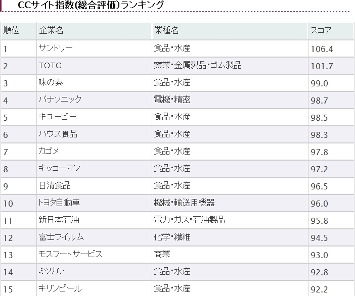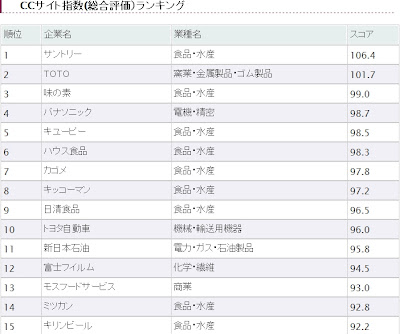 日本ブランド戦略研究所は、有力企業251社の企業情報サイトについてユーザーからの評価を行い、その結果を公表した。1位は2年連続サントリーで、全てのコンテンツで安定した高い評価を得た。2位はリニューアルを行ったTOTOとなった。