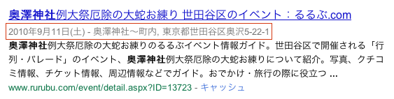 イベント用のリッチスニペット がイベントの一覧ページだけでなく、個々のイベントの詳細ページに対しても利用出来るようになりました。個々のイベントのページにイベント用の構造化データが存在する場合、下の例のようにページタイトルの下にイベントの日付と開催場所の情報がリッチスニペットとして表示されるようになります。
