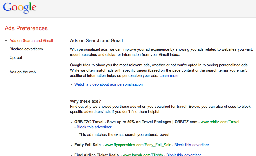 広告表示設定 (Ads Preferences Manager)では、特定の広告主の広告をブロックすることや、広告のパーソナライズ表示を無効にすることができます。広告のパーソナライズ表示が有効になっている場合は、関連性の高い広告が的を絞って表示されるようになるため、ユーザーが広告表示の仕組みを理解した上で選択できるよう、統計情報と説明の動画も用意しました。