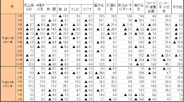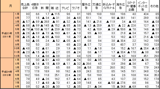 下記表は媒体別月別の対前年同月比を示している。▲マークはマイナスを意味する。