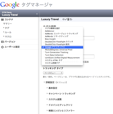 Google アナリティクス リマーケティングのタグの設定も、「 タグの種類 」で 「 Google アナリティクス 」を指定することで簡単に実施できます。