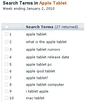 2009年末くらいから噂になり始めている「米Appleの新型タブレットPC」だが、既に検索でも関心を呼び始めているようで、どんなものなのか、リリース日はいつなのかなどに関心があるようだ。検索結果からは、ヤフーをはじめ各種メディアに飛んでいっている。