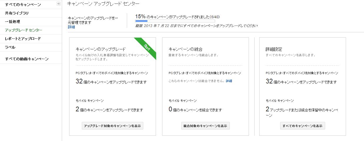 移行の時期について2013 年 7 月 22 日より、すべてのキャンペーンをエンハンスト キャンペーンにアップグレードいたします。エンハンスト キャンペーンに関するご意見、ご要望がございましたら、