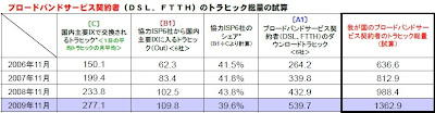 2009年11月時点の日本のブロードバンドサービス契約者の総ダウンロードトラヒックは、推定で約1.36T(テラ)bpsであり、この1年間で約1.4倍(37.9%増)となっている。