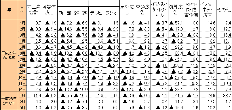 2016/3広告業売上、全体では前年同月比1.0%増、マス4媒体は再びマイナスに、ネット広告は同10.2%増 | Insight for WebAnalytics