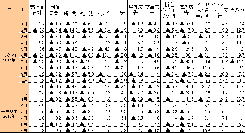 2016/6広告業売上、全体では前年同月比4.9%増、マス4媒体は0.8%増、ネット広告は同14.4%増 | Insight for WebAnalytics