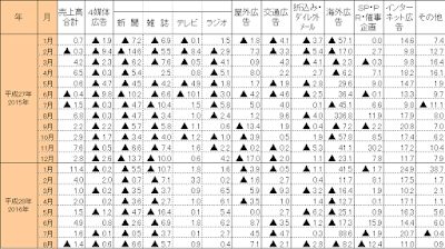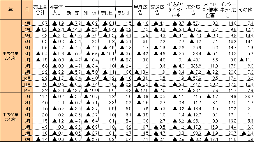 2016/8広告業売上、全体では前年同月比1.4%減、マス4媒体は0.6%減、ネット広告は同11.0%増 | Insight for WebAnalytics