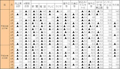 2018/8広告業売上、全体では前年同月比2.7%減、マス4媒体は同3.4%減、ネット広告は同5.4%増 | Insight for WebAnalytics