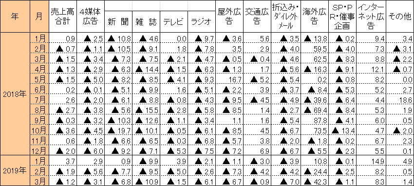2019/3広告業売上、全体では前年同月比1.2%減、マス4媒体は同3.1%減、ネット広告は同8.3%増 | Insight for WebAnalytics