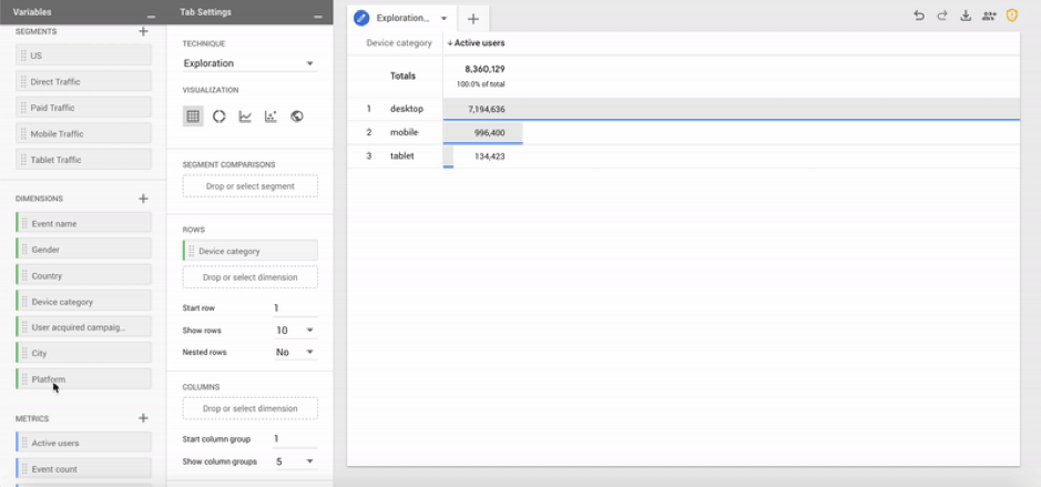 - データ探索: さまざまな変数(ビジネスの測定に使用しているセグメント、ディメンション、指標)をキャンバスにドラッグ&ドロップすると瞬時にデータがビジュアル化され、臨機応変な分析が可能です。