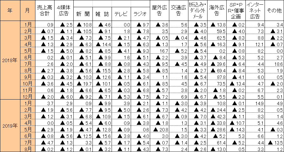 2019/8広告業売上、全体では前年同月比0.2%減、マス4媒体は同1.2%減、ネット広告は同3.3%増 | Insight for WebAnalytics