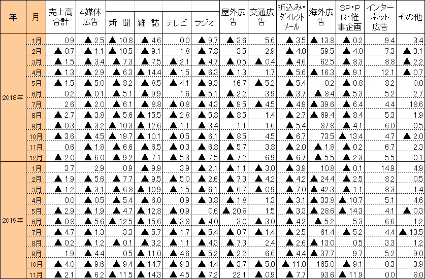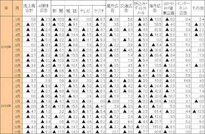 2019/11広告業売上、全体では前年同月比2.1%減、マス4媒体は同6.2%減、ネット広告は同増減なし | Insight for WebAnalytics