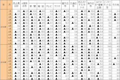 2019/12広告業売上、全体では前年同月比0.4%減、マス4媒体は同4.0%減、ネット広告は同1.0%増 | Insight for WebAnalytics