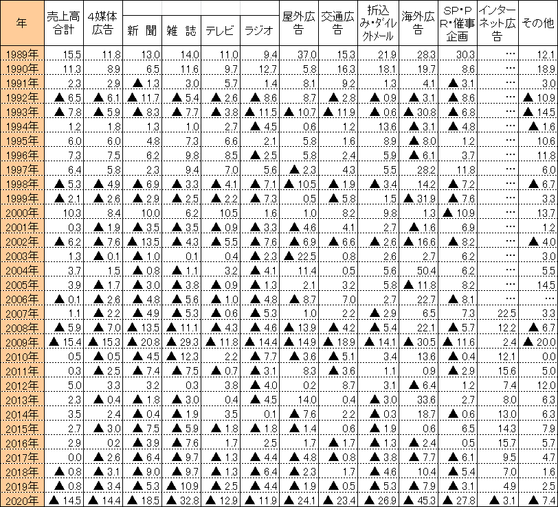 2020暦年の広告業売上、全体では3年連続で前年比マイナスで11年ぶりの二桁減、マス4媒体は同14.4%減、ネット広告は初のマイナスに | Insight for WebAnalytics