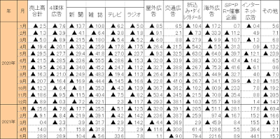新聞は10.4%増で、こちらも先月に引き続き驚異の二桁増。対照的なのは雑誌は5.6%減で、マイナスは73カ月連続。テレビは同33.6%増。ラジオは同7.8%増で、2カ月連続のプラス。