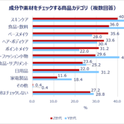 特にどのようなカテゴリの商品をチェックしているかを質問、世代別で比較したところ、1位は両世代で「スキンケア」(Z世代:40.0%/Y世代:45.2%)、2位は「食品・飲料」(Z世代:36.0%/Y世代:44.8%)だった。Y世代は「衣類・ファッション小物(40.8%)」「日用品(31.2%)」でもチェックする割合が多かった。