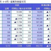 農・林・漁・鉱業は同10.3%増の64件で4年連続、小売業は同7.6%増の594件と不動産業は同18.1%増の169件とそれぞれ3年連続で前年同期を上回った。一方、金融・保険業は同30.7%減の9件が2年連続、製造業が同3.4%減の565件、運輸業が同6.2%減の209件、情報通信業が同11.1%減の200件と4年ぶり、卸売業が同11.7%減の564件と3年ぶりにそれぞれ前年同期を下回った。