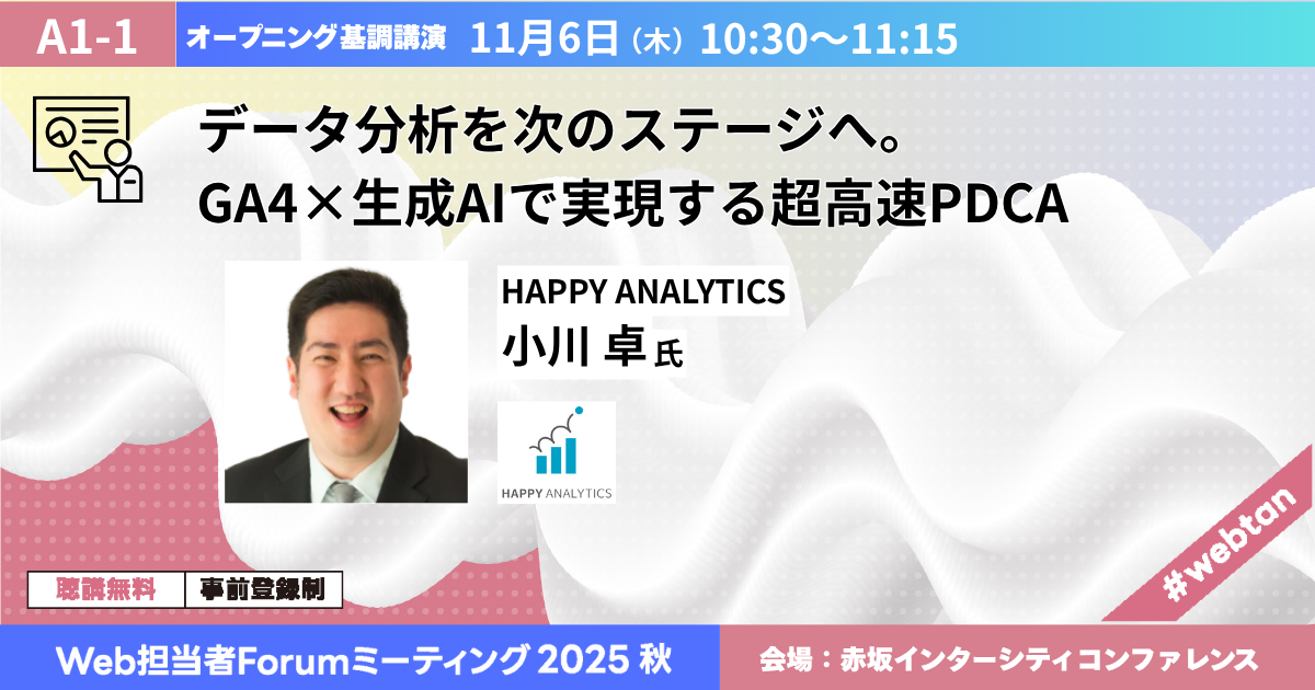 GA4の画面で、「どこを見ればいいのかわからない」「設定に迷う」「レポート作成に時間がかかる」といった課題を抱える担当者が多くいます。本講演では、生成AIを組み合わせることでGA4を効率的に使いこなす方法を解説。分析設計、レポート作成、インサイト抽出などのプロセスをAIがどう支援できるのか、月次レポート作成のプロンプトなども共有いたします。高速でPDCAを回すための実践テクニックを紹介します。