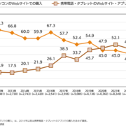 ネットショッピングやオークション利用率の年次推移について、「携帯電話・タブレットのWebサイト・アプリでの購入」が前年調査比4.2ポイント減の50.8%。「パソコンのWebサイトでの購入」は同0.4ポイント減の40.2%だった。2020年の調査で携帯電話・タブレットがパソコンを上回り、以降はいずれも横ばいが続いている。