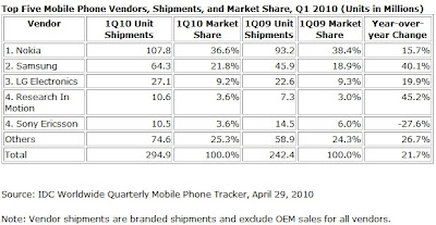 完全な状態のオリジナル記事は 「2010年Q1世界の携帯電話の出荷台数、対前年同期比21.7%増」 からご覧ください。