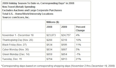 2009/12/20のcomScoreのリリースから。12/14のGreen Mondayの売上は対前年比マイナス1%だったが、12/15売上は対前年比で21%と非常に好調だ。1日に8億ドルを超える売上となった日は9日となった。