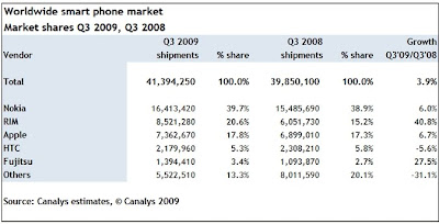 2009/11/3のCanalysのリリースから。 地域別ではアジアが二桁成長、北米は一桁成長、EMEAが一桁ダウン、南米が二桁ダウンとバラバラ。OS別では、Symbianが46.2%と首位を堅持、RIMが20.6%と2位に浮上。