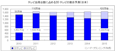 2010年の3Dテレビの世界市場規模は240万台。2015年のテレビ出荷台数(単年度)に占める3Dテレビの割合は、世界では、約21%の5,000万台。日本では、約26%の420万台。