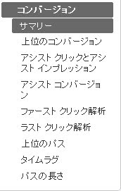 Assisted Clicks and Impressions, Assisted Conversions, First and Last Click Analysis, Time Lag, and Path Length。日本語では、画面の通りになっている。