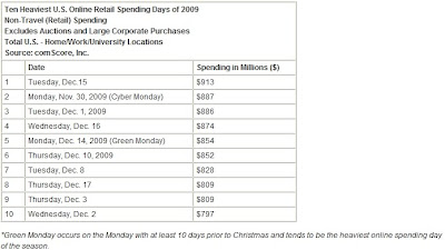 2009/12/20のcomScoreのリリースから。12/14のGreen Mondayの売上は対前年比マイナス1%だったが、12/15売上は対前年比で21%と非常に好調だ。1日に8億ドルを超える売上となった日は9日となった。