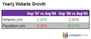 2009/11/5のcompeteのブログから。PS3が2009/8/19に価格引下げを発表してから、playstation.com利用者がnintendo.comを上回ってきた。