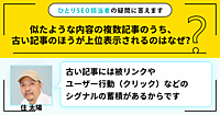 SEO担当者の質問に、SEOのエキスパートである住 太陽さんが実践的で有効な解決法を答えます。今回の質問は「似たような内容の複数記事のうち、古い記事のほうが上位表示されるのはなぜ?」です。