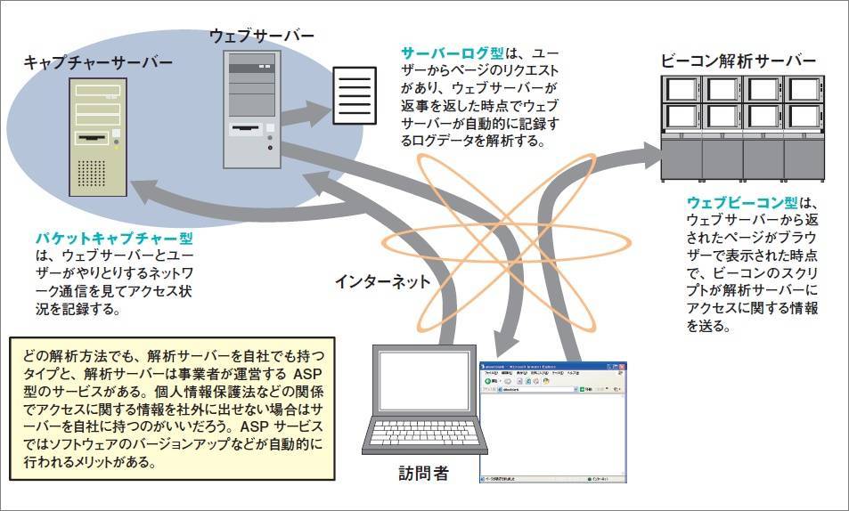 第3の方法は“パケットキャプチャー型”だ。これはウェブサーバーと同じネットワークに解析サーバーを設置して、ウェブサーバーに送られるすべてのネットワーク信号をコピーして解析するものだ。リアルタイムに結果が見られ、画像へのアクセスも把握できる。LAN内に複数のサーバーを抱えているサイトや、大きなキャンペーンを展開するサイトにはパフォーマンス的にも特におすすめの方法だと言える。