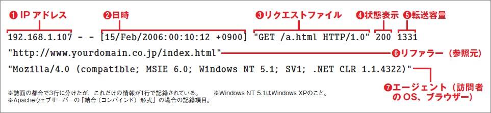 この例では、訪問者はa.htmlというページを見たいと要求した(3)。また、このサイトのindex.htmlにあるリンクをクリックしてきたことがわかる(6)。時間は、日本時間の2006年2月15日、午前0時10分12秒だ(2)。このユーザーは、Windows XPでIEを使っているらしい(7)。