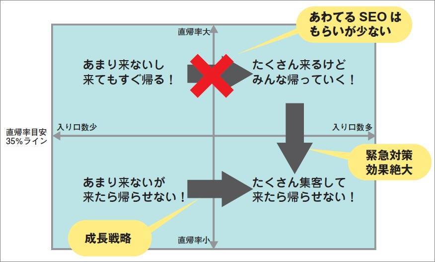 この状況でSEO対策をやっても、効果は上がらないだろう。SEOで1万人増えても、うち6千人が1ページしか見ないで帰ってしまっているとしたら、「費用対効果」のはるか以前の話と言う他ない。
