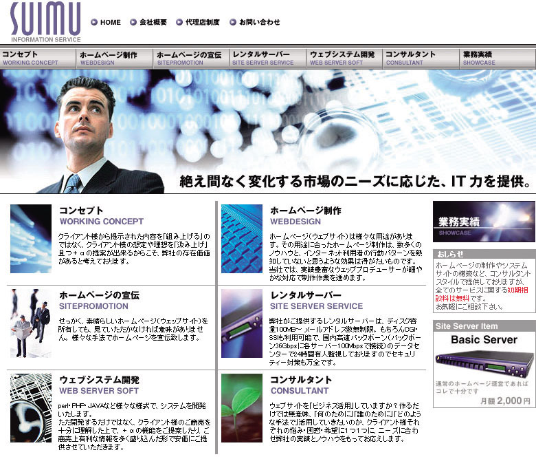 78年から機械器具の設置工事を行ってきたスイムだが、97年に企業向けのインター ネットコンサルティング業務を開始したのを契機にIT事業を手がけるようになった。当初は、インターネットへの接続方法やメールの使い方などの基本操作をレクチャーするだけであったが、徐々にホームページ制作の要望が高まってくる。岩井迫氏が以前に印刷物のデザインをしていたことから、98年にはウェブサイト制作業務を行うようになり、そのためにレンタルサーバーを利用するようになっ た。