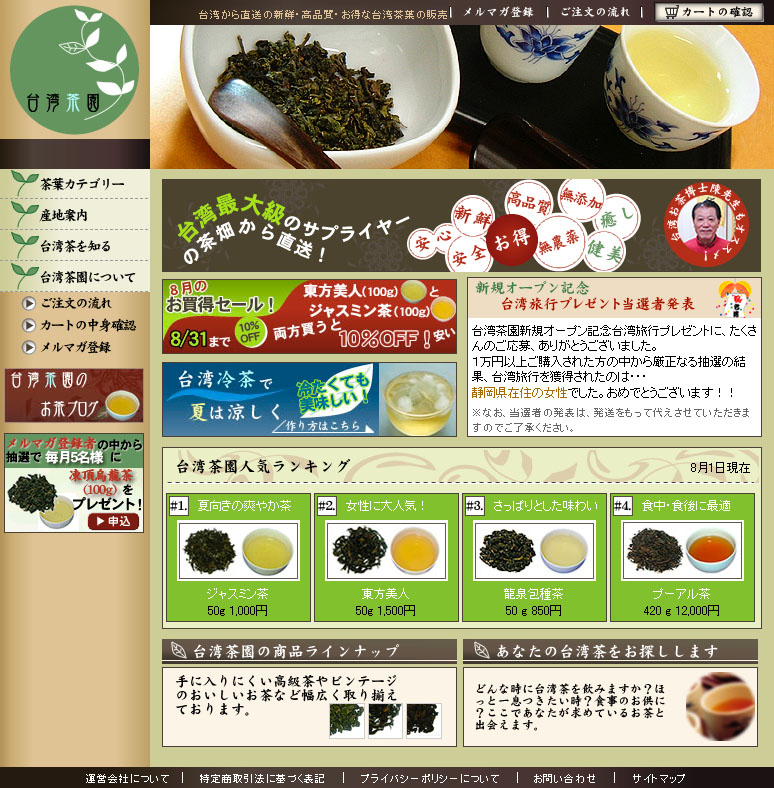 台湾茶園は台北にある荘原有限公司の中国茶を販売するインターネットショップで、海外ツアーや航空券販売で有名な株式会社エイチ・アイ・エスのコンテンツ企画制作グループが運営を代行している。2005年7月6日オープンしたばかりのサイトだが、エイチ・アイ・エスが新しい事業として物販を開始したのだろうか。その辺りからインタビューを始めると、サイト開設のきっかけは“旅行客の声”だったという答えが返ってきた。
