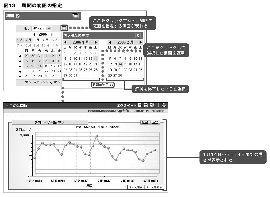 たとえばあなたのサイトでバレンタイン特集を組んだとします。2月14日までの1か月の訪問数とページビュー数などを調べたいときに「期間」の範囲の指定機能を使います。ここでは、2006年1月14から2月14日までを指定してみましょう。