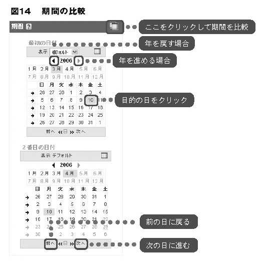 キャンペーンを始める前と始めてからの訪問数を調べたい場合があるでしょう。そのようなときは期間の比較をすることでその効果を測定することができます。まずは2006年の3月10日と2006年の4月10日を比較してみましょう。