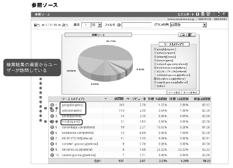 前項の参照ソースの中でも特に検索エンジンに着目し、ユーザーがどの検索エンジンを利用してあなたのWebサイトにたどりついているかを検証します。