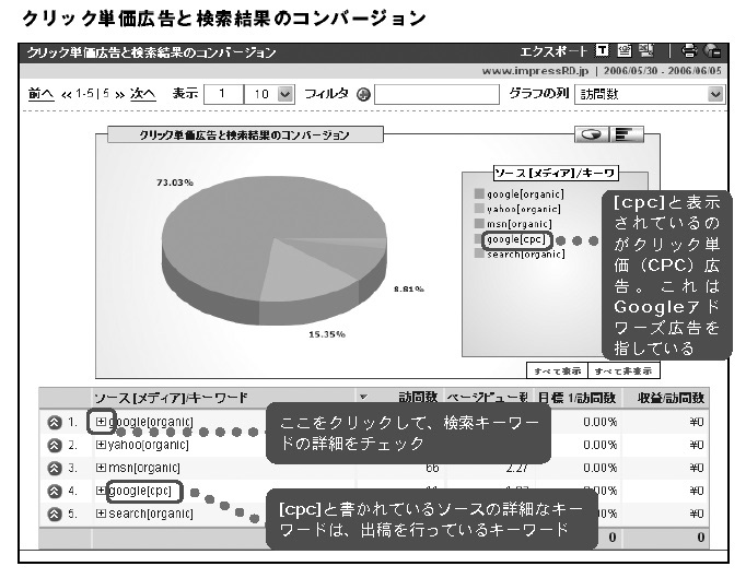 検索エンジンごとの傾向をつかんだら、各項目の横にある「+」をクリックして、該当の検索エンジンでユーザーが利用した検索キーワードの詳細をチェックします。同じ検索エンジンでも、目標に到達したユーザーにはっきりと違いがあることがわかるはずです。あなたのWebサイトを訪問するユーザーはどのような検索エンジンを使い、どのような検索キーワードを用いているのでしょうか。その組み合わせの中でも、目標に到達しているユーザーが多いものと少ないものがあるはずです。
