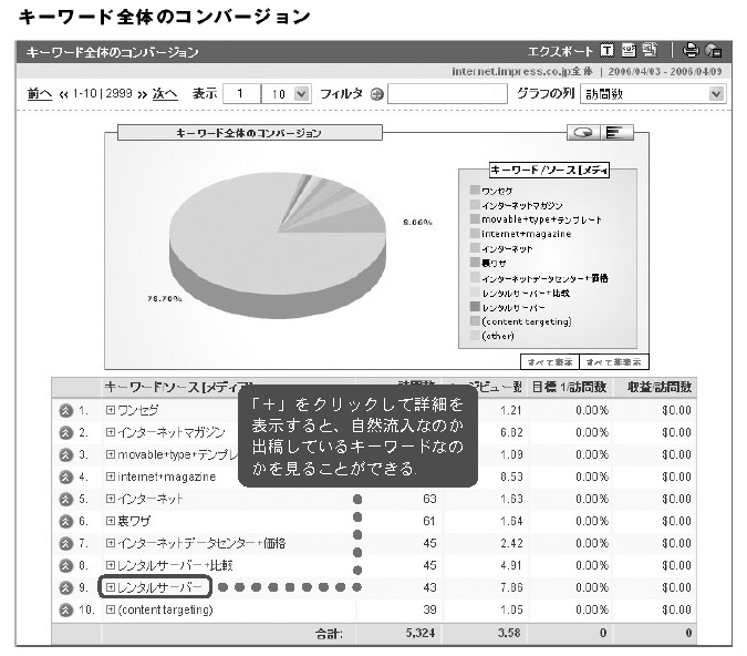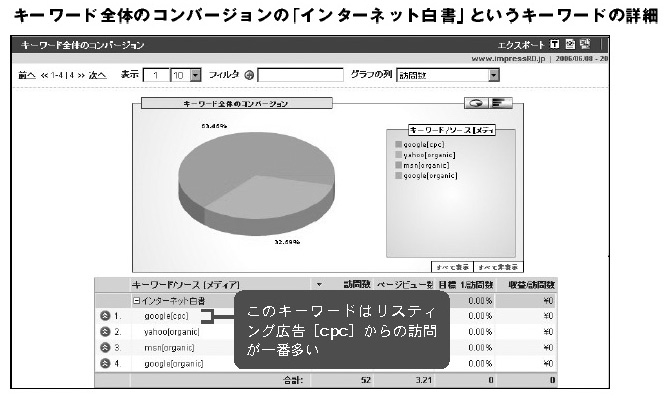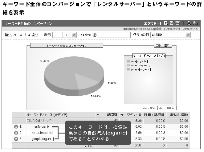 このレポートでは、検索エンジン別に表示されるので、まずは、無料:有料の割合を見ます。この割合が20:80なら、そのまま出稿を続けてもかまわないでしょう。もし、出稿をストップしてしまったら、このキーワードであなたのサイトを訪問したユーザーのうち、80%を失うことになります。