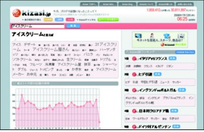また、ブログで話題になっているキーワードを表示できるkizasi.jpを使って、ブログでアイスクリームに関連したエントリーがどの程度流通しているかを確認できる(図12)。