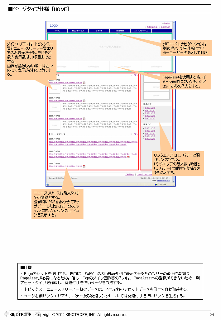 FatWireの提供するCMSであるContent Serverを使ったシステム構築における基本設計書の例。これは、ある出力ページに関して、どのようなコンテンツがどこにどのような形式で表示され、最大で何項目まで表示されるかや、その他の注意点などが示されている。