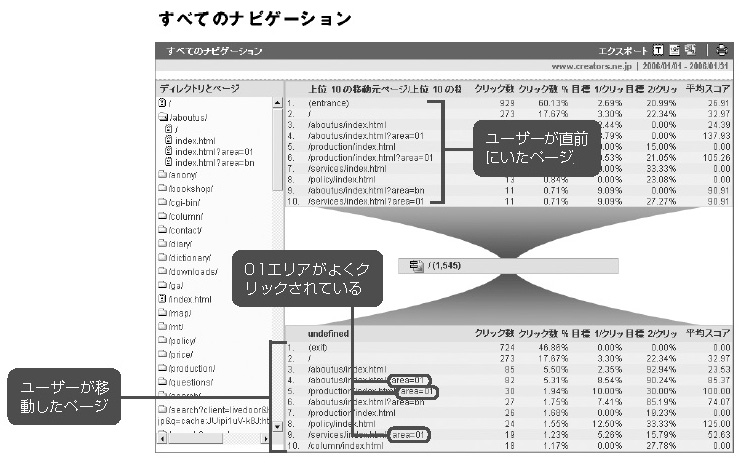 たとえば、4分割された画面のどのエリアがよくクリックされているのかを調べるだけでも、レイアウトのヒントが生まれます。あまり細かく分割しすぎると、うまく裁ききれないので、適当な大きさにしておきましょう。左の画面では、トップページからの移動に01エリア(area=01というパラメーターをあらかじめ埋め込んであるところ)にあるリンクがよくクリックされていることがわかります。
