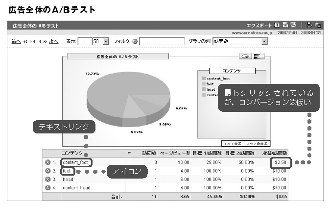 画面では、content_footがテキストリンク、footがアイコンであるように、あらかじめ設定しています。ここでは、テキストリンクをクリックしているユーザーが圧倒的に多くなっています。このような場合、せっかく作ったアイコンが「クリックできるもの」としてユーザーに認識してもらえていない可能性があります。