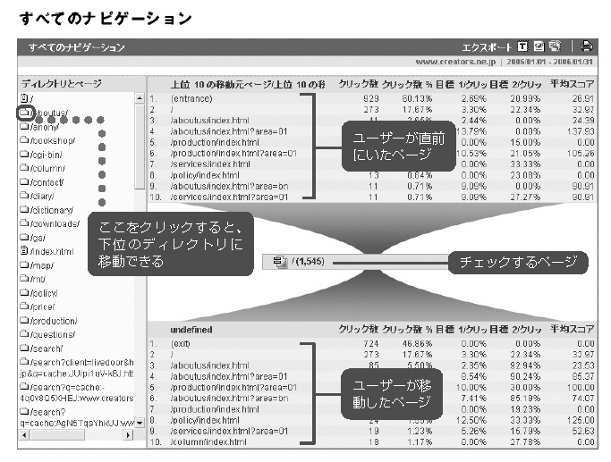 このレポートは、どのページをチェックするかを決めてから見たほうがよいでしょう。なぜなら、あなたのWebサイトでGoogle Analyticsのタグを埋めたすべてのページについて、ユーザーがその直前に閲覧していたページと、その直後に移動したページが表示されるからです。Google Analyticsのタグを埋め込んだページすべてについてこのレポートでその動線をチェックしてもよいのですが、それには膨大な時間を必要とします。