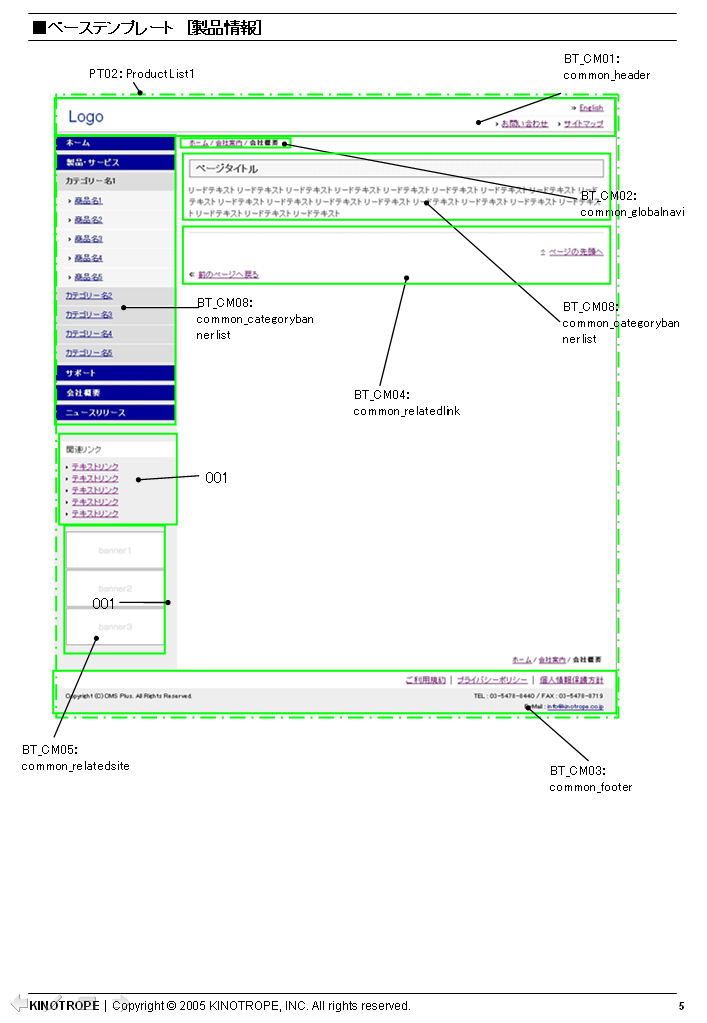 ベーステンプレートの設計書。ページ全体をどのようにブロック分けして、それぞれのブロックにどのような要素が入るのかを定義している。