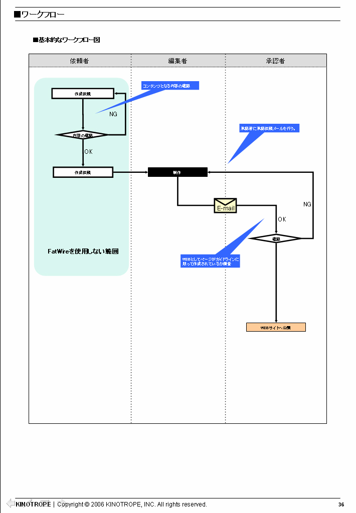コンテンツ作成依頼から制作、承認、公開までの流れ(ワークフロー)が明快に図示されている。