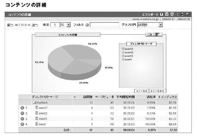 この画面では、1つのSWF(Flashファイル)の中に「event、event1、event2、event3」という4つのイベントがあり、ユーザーはそれぞれのイベントをページビュー数の分、実施したということを示しています。